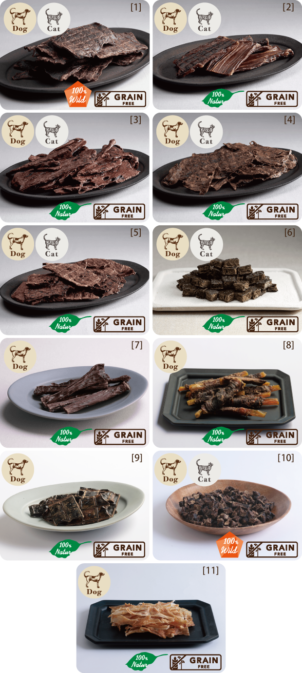 [1]極上 鹿肉(30g・犬猫用)/[2]極上 黒毛和牛(50g・犬猫用)/[3]馬肉 FUWARI(20g・犬猫用)/[4]黒毛和牛 FUWARI(20g・犬猫用)/[5]黒豚 FUWARI(20g・犬猫用)/ [6]鶏レバーキューブ(50g・犬猫用) /[7]ビーフガレット(50g・犬用)/[8]極上 馬すじ 馬肉巻き(50g・犬用)/[9]堅焼き 馬レバー(30g・犬用)/[10]カンガルーキューブ(50g・犬猫用)/[11]極上 七面鳥アキレス(30g・犬用[成犬用])