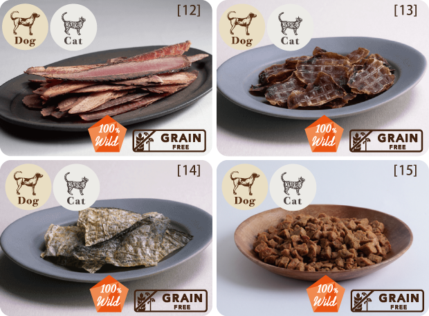[12]燻製かつお 厚削り(30g・犬猫用)/[13]鮫フィレ(40g・犬猫用)/[14]鯛皮づくし(15g・犬猫用)/[15]紅鮭キューブ(50g・犬猫用)