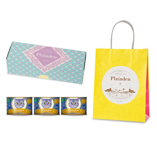 ウェットフード3缶ギフトBOXとオリジナルショッピングバッグのセットです。ウェットフードは大自然で育まれたドイツ産トラウトを99.5%使用した「100%Natur ジャーマン トラウト」。プレゼントに最適です。