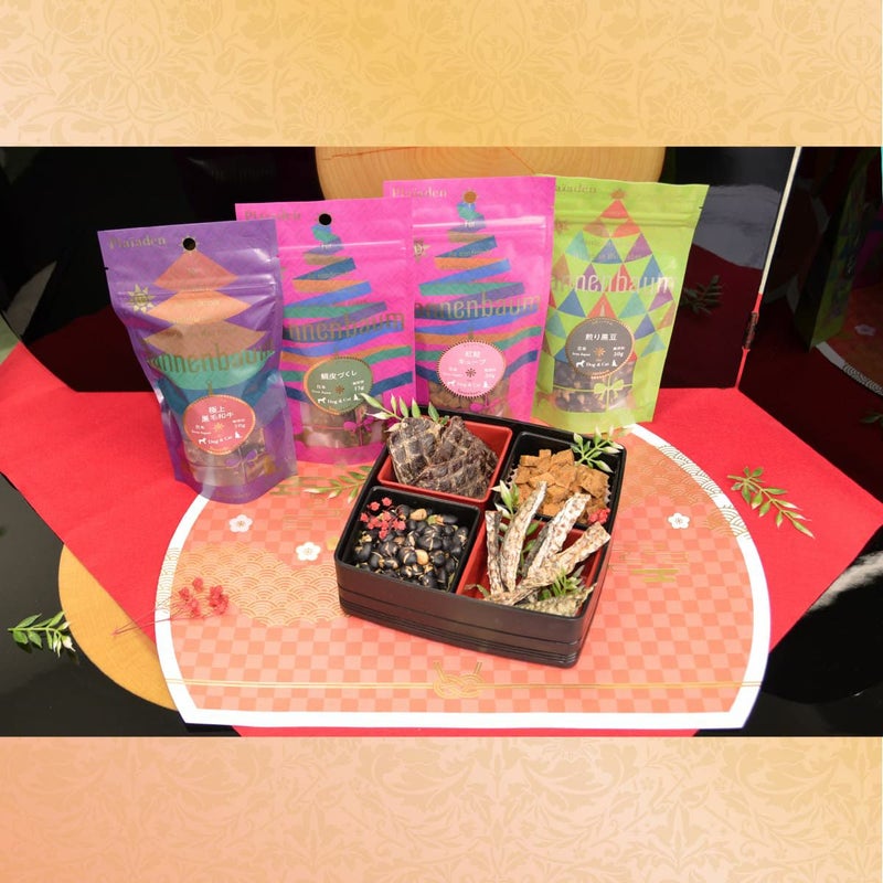 愛猫用のおせちにぴったりな商品をセットにしました。「極上 黒毛和牛」「鯛皮づくし」「紅鮭キューブ」「煎り黒豆」のおやつ4点セット。