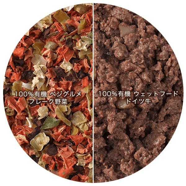 風味豊かなドイツ牛のウェットフードに、ぬるま湯でふやかしたベジグルメを加えてスープ仕立てに。栄養価の高い有機野菜を厳選した「100%有機 フレーク野菜」は、愛犬に必要なビタミンや鉄分、カルシウムを手軽に補えます。