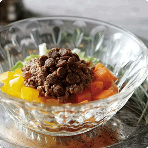 現在の日本では、ドライタイプのドッグフードが主流になっています。しかしペット先進国ドイツをはじめとするヨーロッパでは、ドライフードとウェットフードを組み合わせて愛犬に与える「ミックスフィーディング」が一般的です。その根底には、穀物主体のドライフードに、ウェットフードのお肉に含まれる良質なタンパク質や微量栄養素、水分をプラスすることで、愛犬に必要な栄養をしっかりと補えるという理念があります。さらに、愛犬の好みや体質に合わせて、鶏肉や鹿肉、ラム肉、魚肉など、さまざまな栄養源を持つフードをローテーションで与えたり、野菜やフルーツをトッピングしたりするのも特徴。これにより、自然界における狩猟スタイルの食事に近づけることができ、犬にとって最適な栄養バランスを保つことができると考えられています。