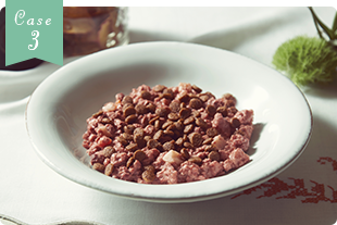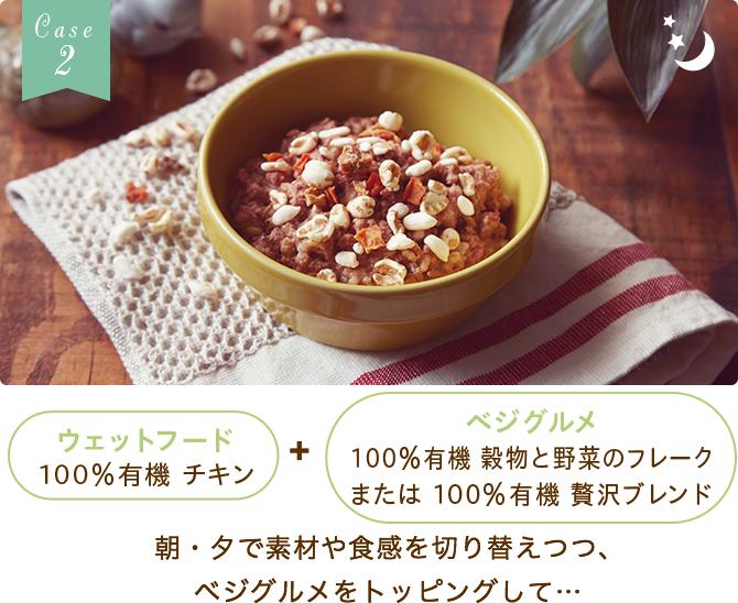 水分をあまり摂らない愛犬には、ウェットフードにお湯でふやかした100%有機ベジグルメを混ぜて…