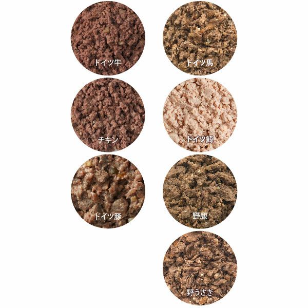 「100%有機 ウェットフード」のドイツ牛・チキン・ドイツ豚、「100%Natur ウェットフード」のドイツ馬・ドイツ鱒、「100%Wild ウェットフード」の贅沢ジビエ 野鹿・贅沢ジビエ 野うさぎ・贅沢ジビエ ドイツ猪の8種類のセット。1缶ずつお試しいただけます。