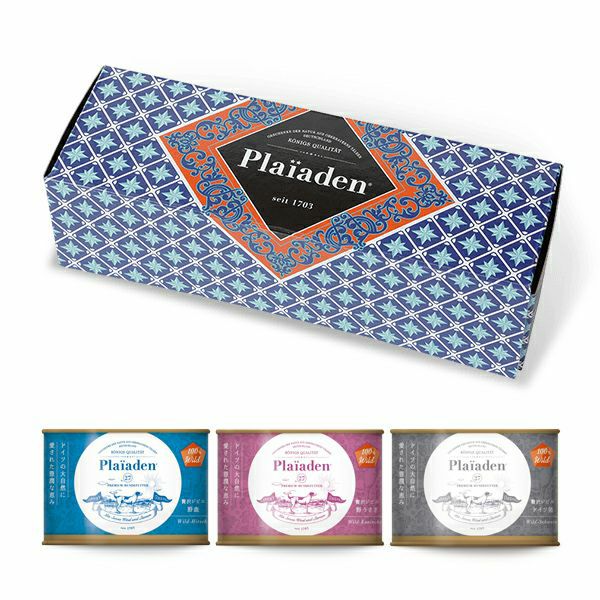 バイエルンの野山を駆けて育った新鮮な猪肉を97%使用。低脂肪、低カロリーのウェットフードです。200g缶を3缶セットでギフトBOXに詰めました。